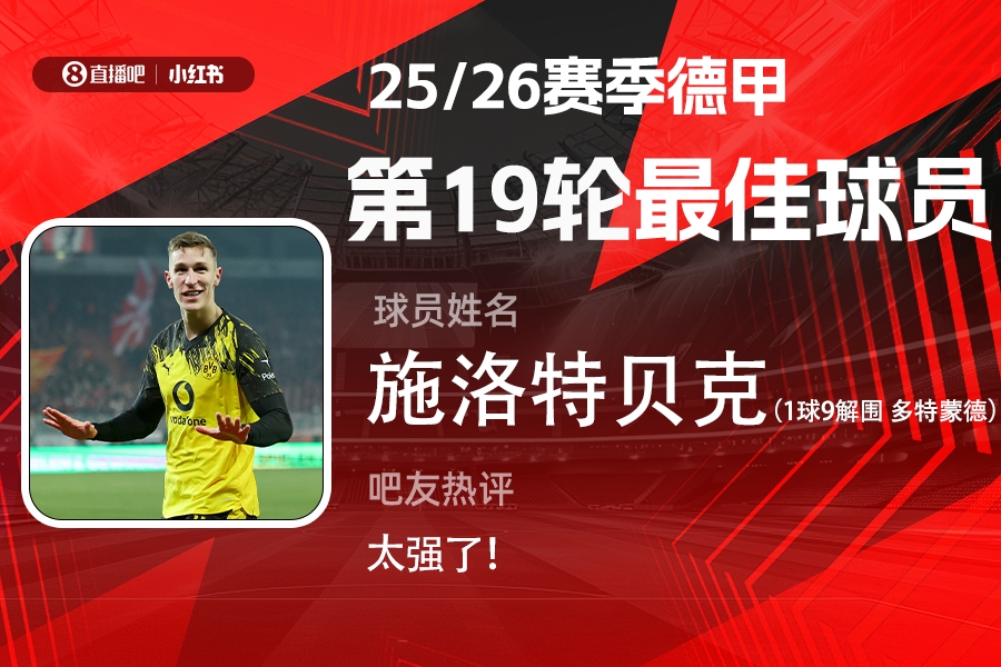 第19轮评选结果出炉,施洛特贝克全场打进1球送出9次解围,攻防两端完美发挥,帮助多特3-0完胜柏林联合,当选【X小红书德甲第19轮最佳球员】!